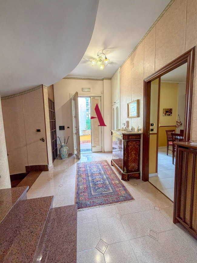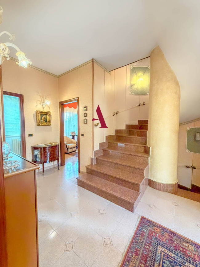L'accoglienza al piano rialzato è affidata a un suggestivo salone a pianta circolare, un elemento architettonico di grande personalità, affiancato da una cucina abitabile e da un accogliente soggiorno con camino, il quale si apre direttamente sul giardino privato di 150 mq: un angolo di verde curato e riservato, ideale per il relax o la vita all'aperto. Salendo al primo piano si sviluppa la zona notte, composta da tre camere da letto luminose, due bagni e un comodo ripostiglio. Il secondo piano è interamente dedicato a una spettacolare terrazza solarium panoramica, un vero balcone sulla città e sulle colline circostanti, perfetto per momenti conviviali o di assoluto riposo.
